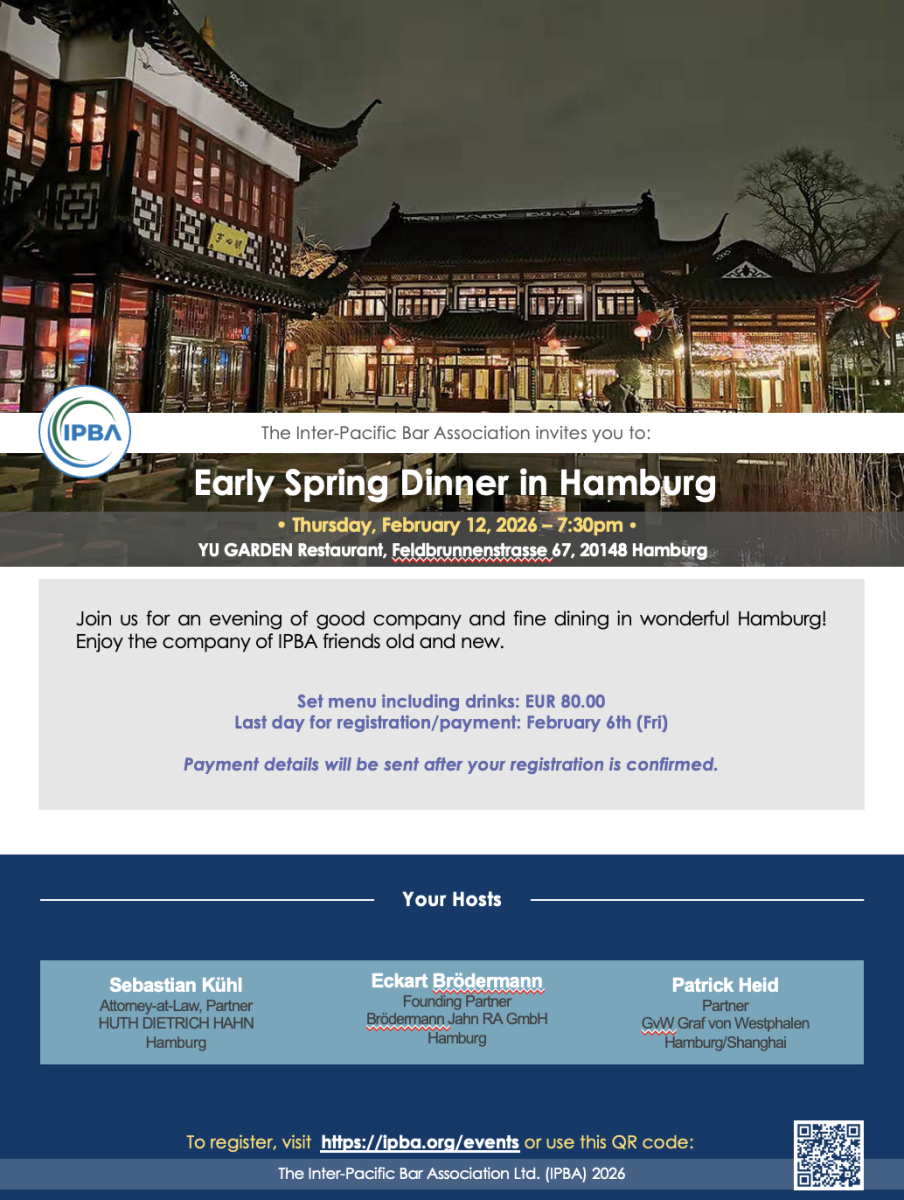 Join us for an evening of good company and fine dining in Hamburg! Enjoy the company of IPBA friends old and new, and your distinguished hosts: IPBA Membership Committee Chair, Sebastian Kühl, and At-Large Council Member for Europe, Frédérique David. Everyone is welcome to attend!