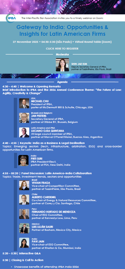 Our panel of experts from Brazil, USA, Belgium, Argentina, India, Chile, Peru, and Mexico will give engaging talks on emerging sectors, cross-border opportunities for Latin American firms, trade, investment trends, and opportunities, followed by an interactive Q&A and a showcasing of the benefits of attending the 2026 IPBA Annual Conference in New Delhi.